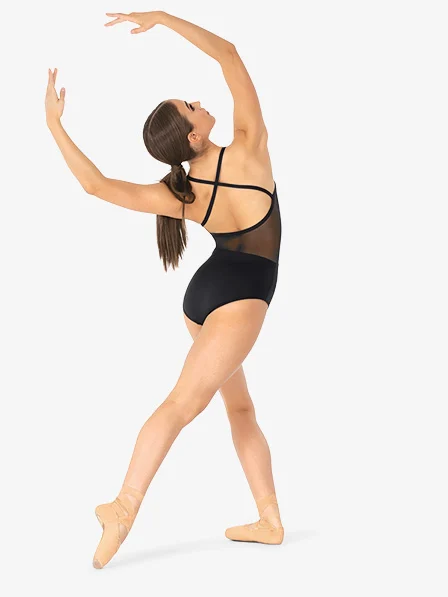 Silkteck leotard Camisole straps Plunging front mesh insert Side mesh inserts X-back with mesh panel Fabric: