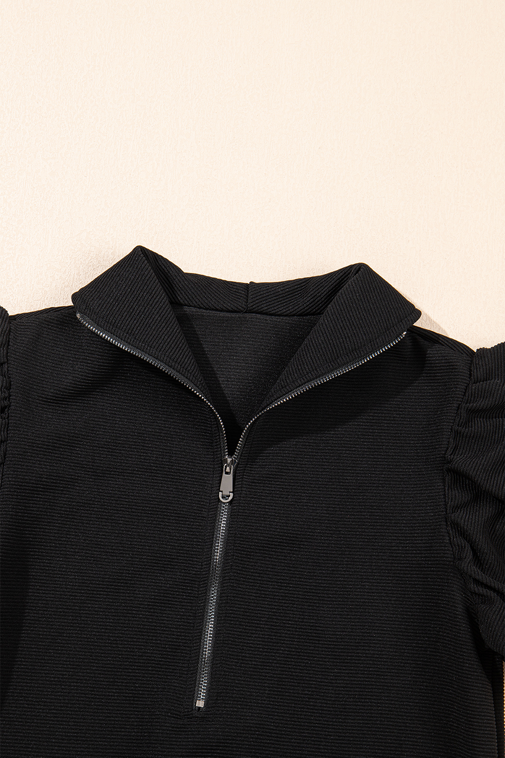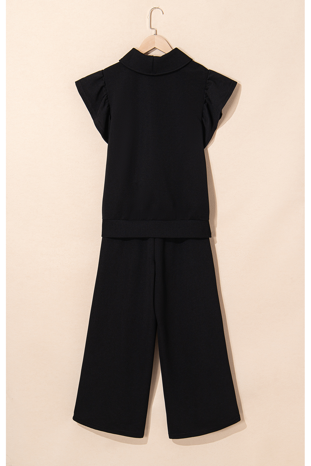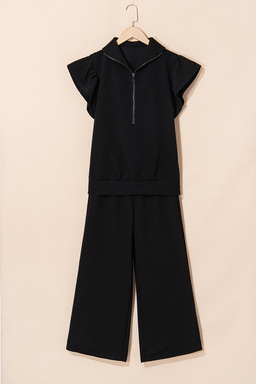 Black Textured Ruffled Sleeve Zipped Top and Wide Leg Pants Set