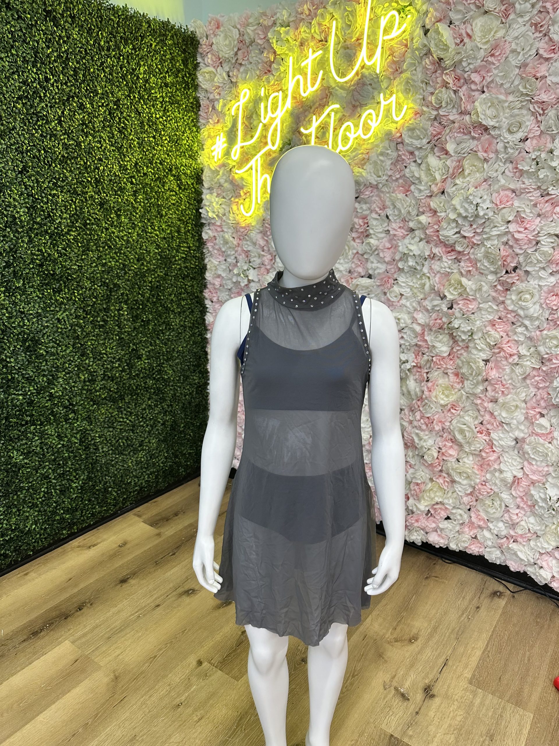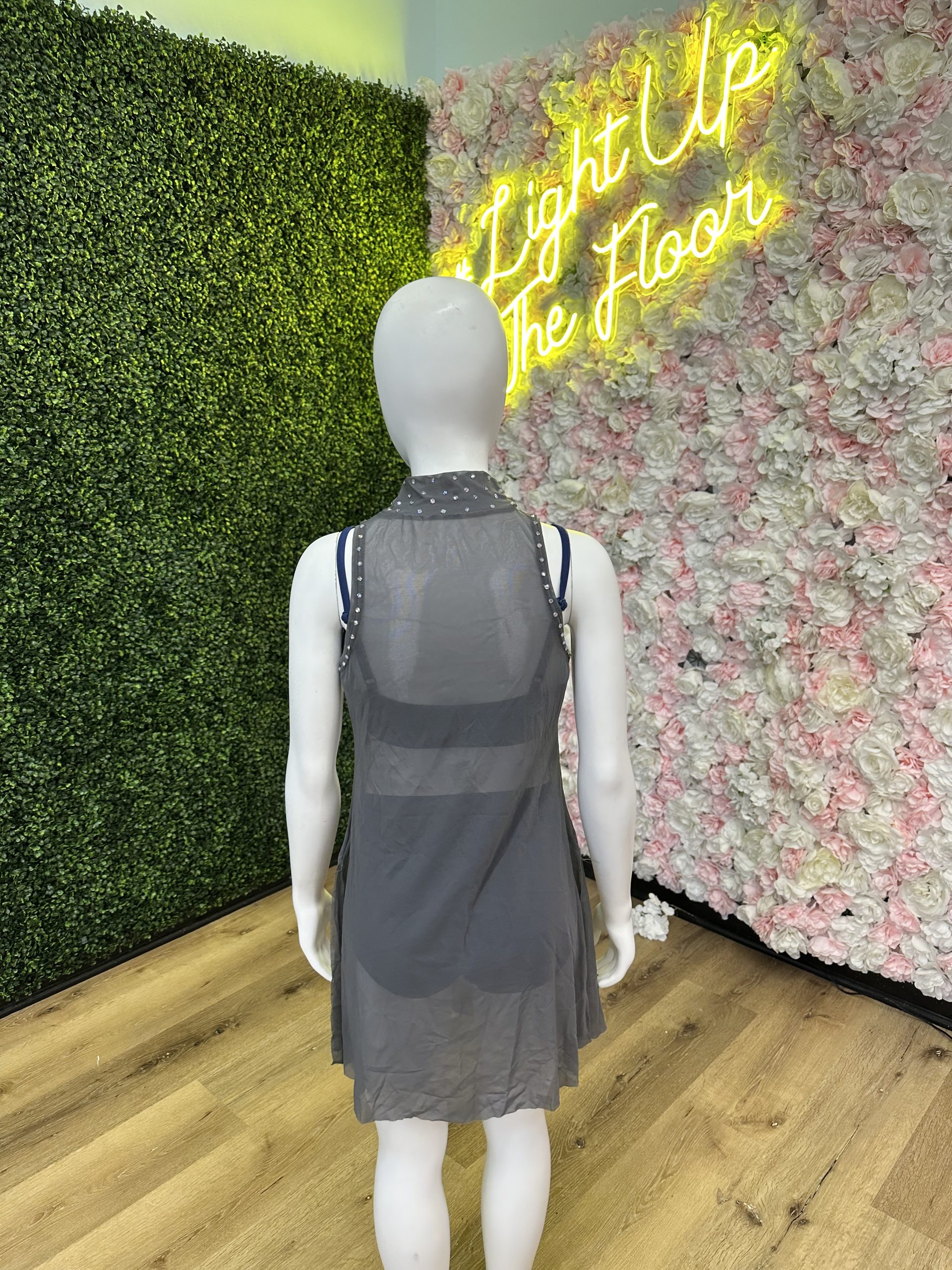 This Costume by Balera features a navy blue bra top and briefs with a slate gray mesh dress Collar and arms are rhinestoned and ready for the stage! Size: Child Large
