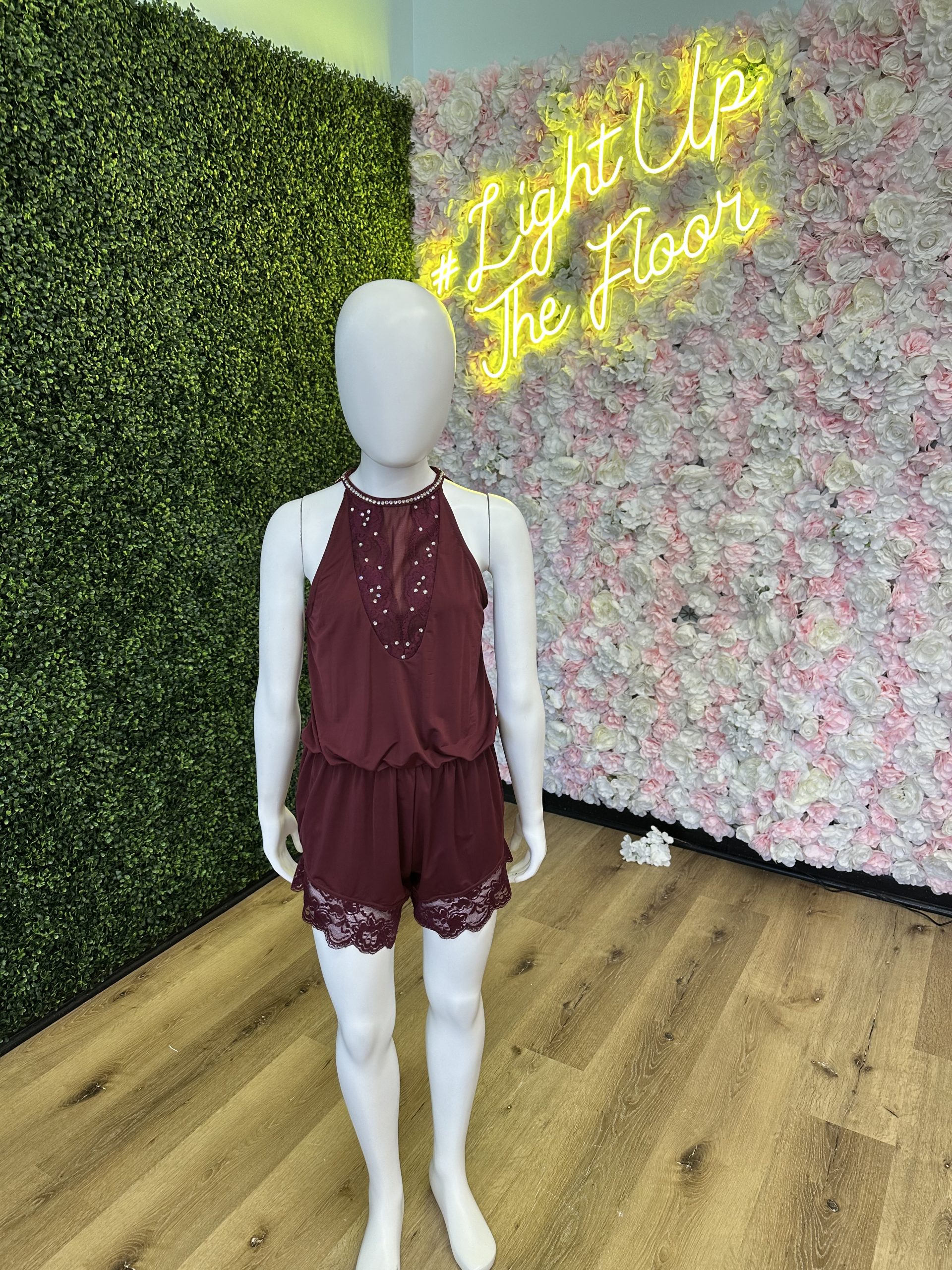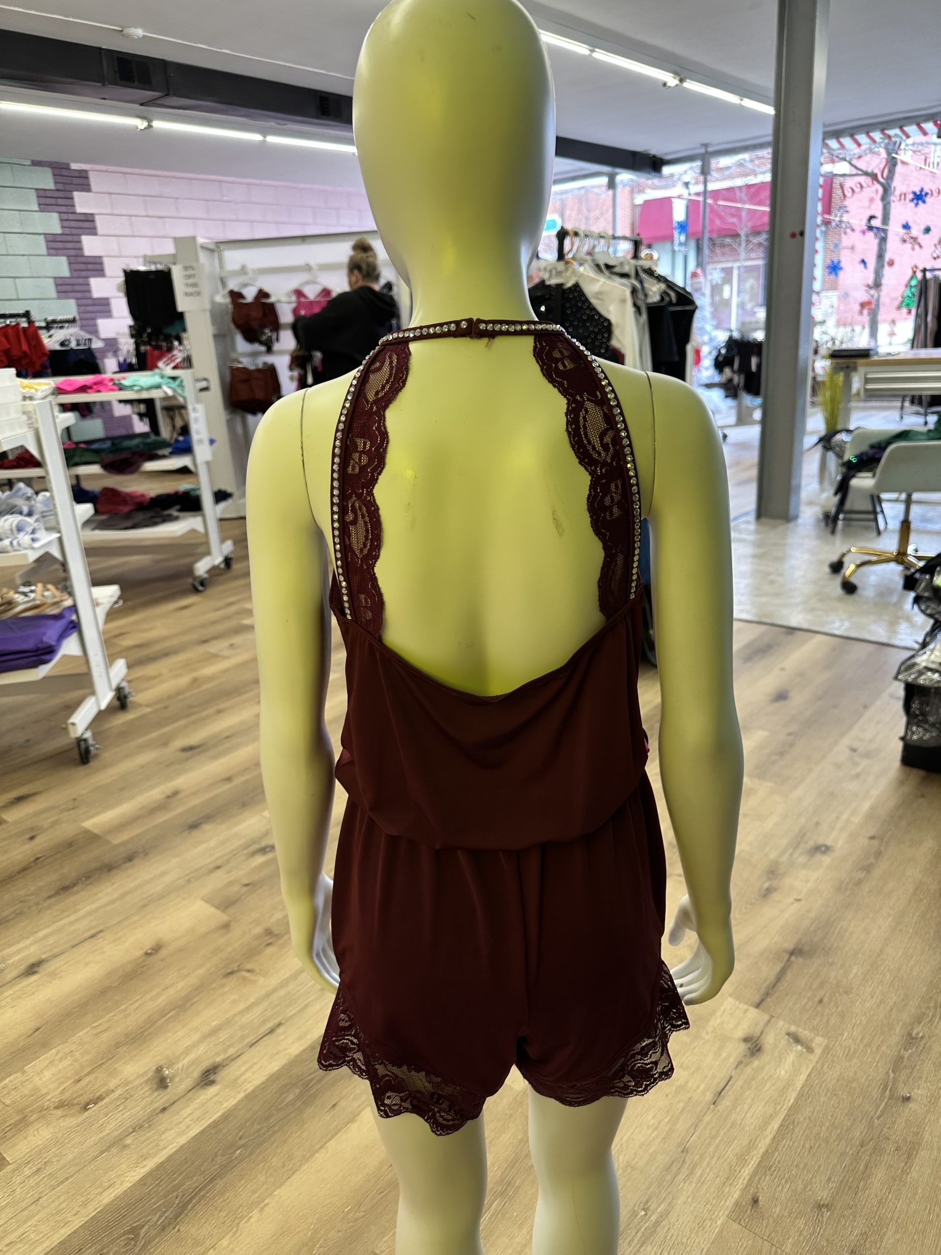 This costume by Balera is an elegant lacey one piece. Rhinestoned and ready for the stage! Size: Child Large